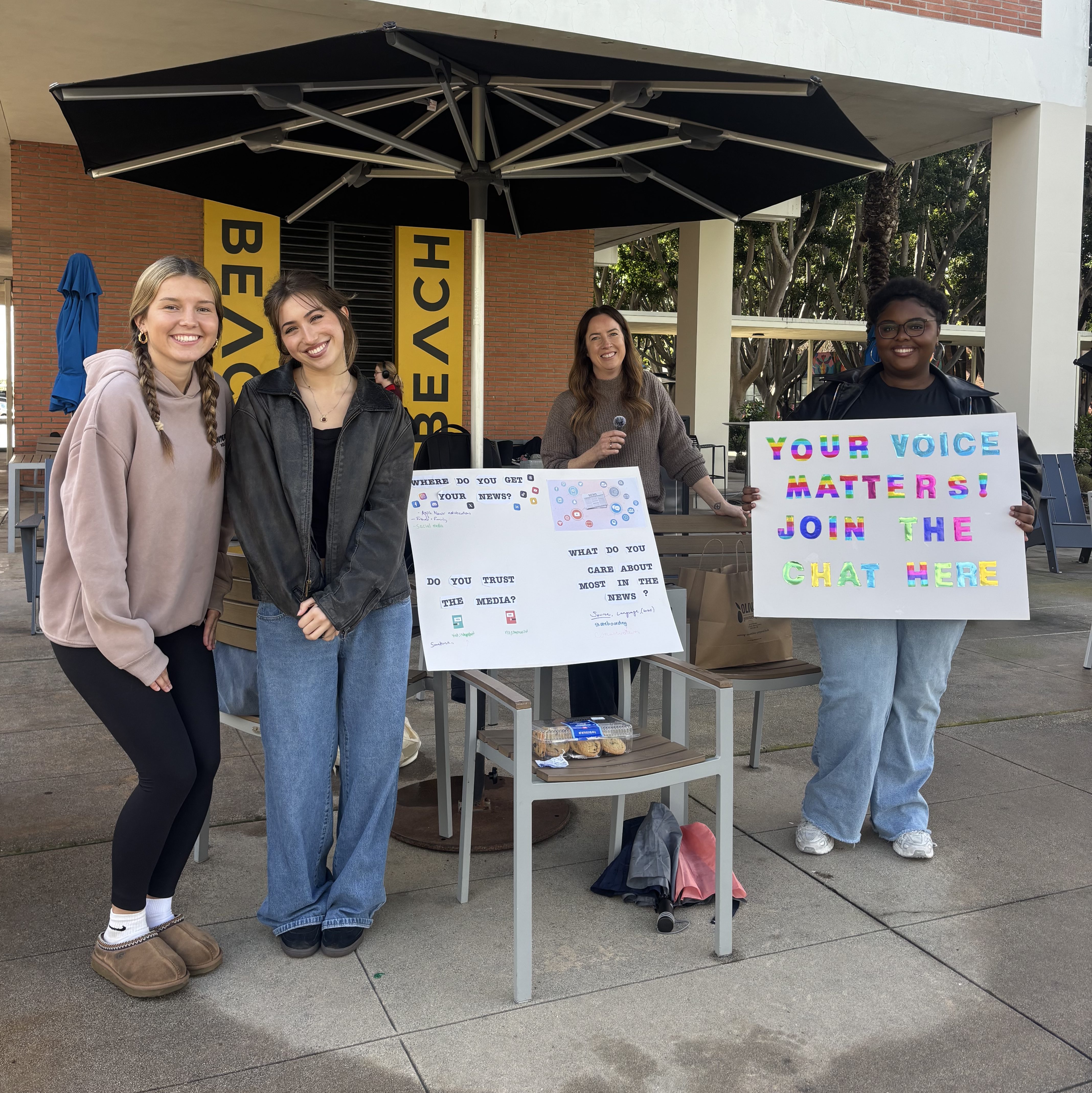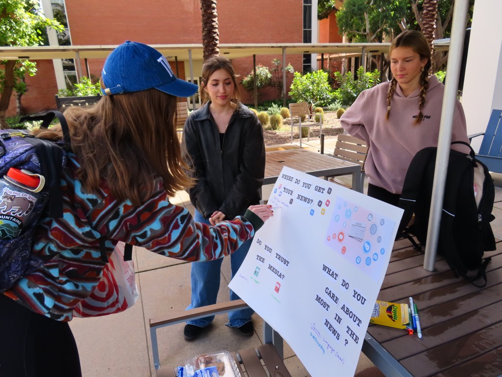 Melia and I took the lead on getting students to start a conversation. We started by asking if they wanted free snacks. Once they approached, we asked them to sign our poster, then tell us anything they wanted about news on campus.